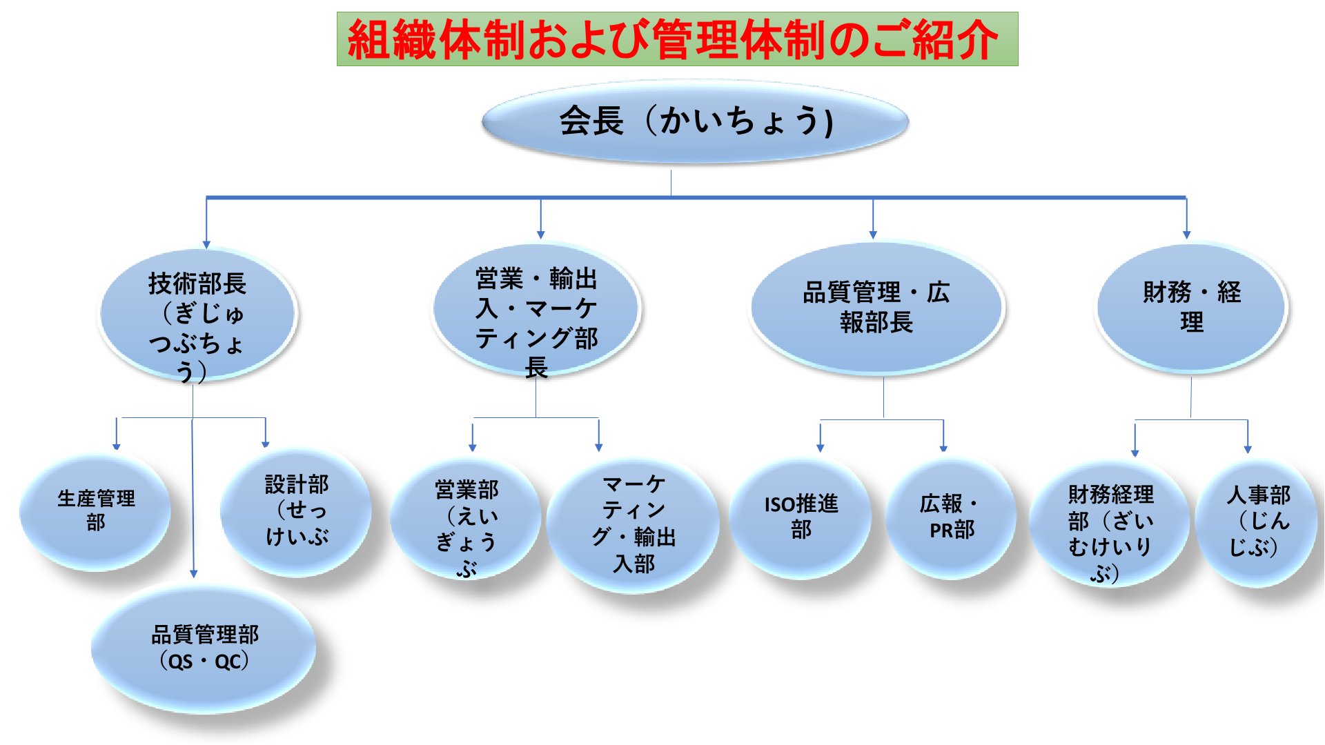 ・技術部長 ・営業・輸出入・マーケティング部長 ・品質管理・広報部長 ・財務・経理部長 各担当ディレクターの下には、それぞれの機能別部門が配置されています。