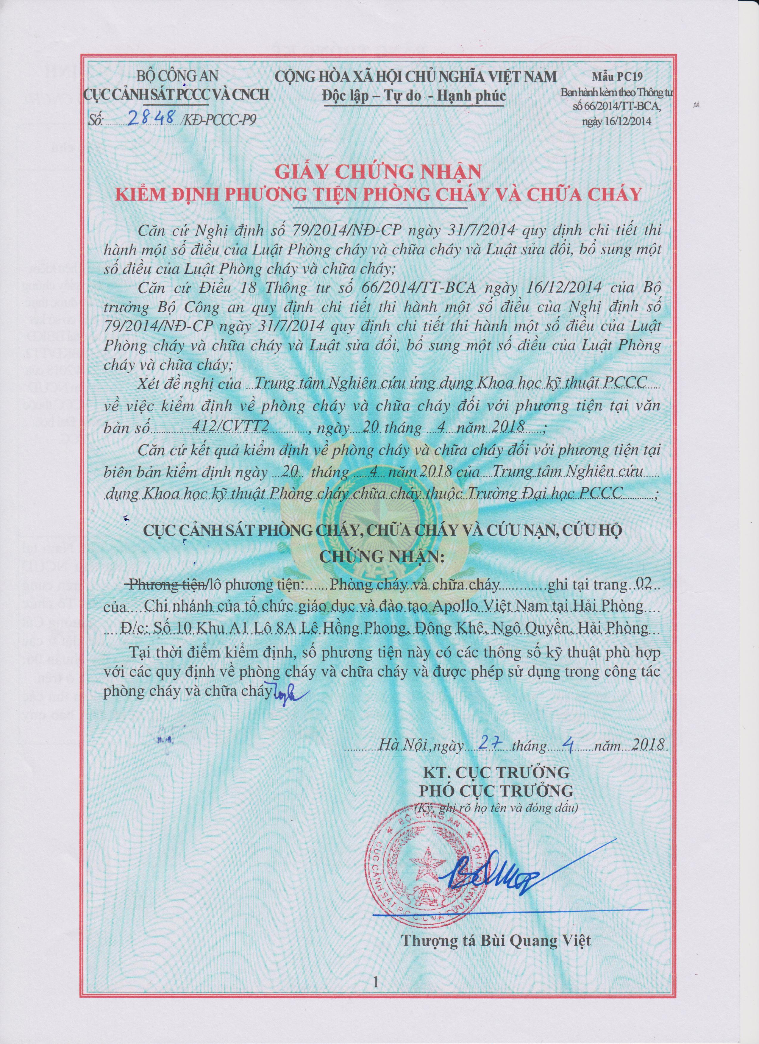 GIẤY CHỨNG NHẬN KIỂM ĐỊNH PCCC DỰ ÁN APOLLO VIỆT NAM TẠI HẢI PHÒNG